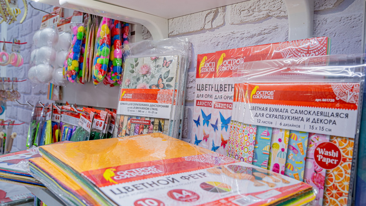 На стеллажах «Острова сокровищ» настоящее наводнение фактур для творчества и хобби. Картины стразами, фигурные дыроколы, блёстки для декора, декоративные перья, цветной фетр, фоамиран и многое-многое другое. И это всё про процесс. Про то, как из листа бумаги и кусочка глины и рождается что-то свое, личное.