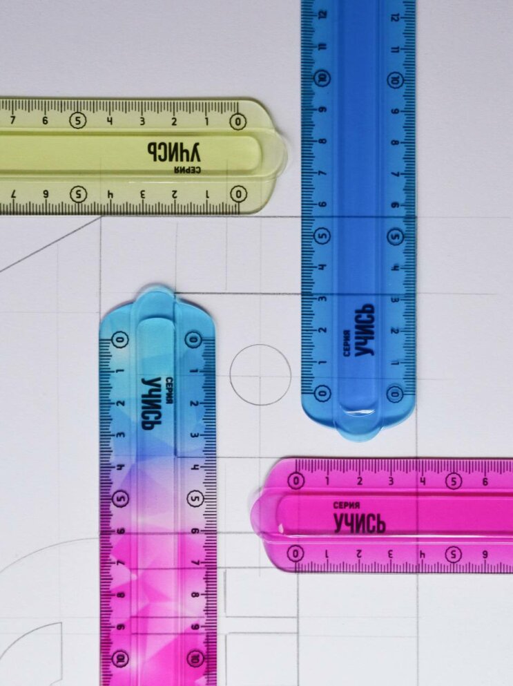 Линейки выпускаются в трех размерах: 15, 20 и 30 сантиметров. Также есть наборы из трех предметов: линейка, транспортир, угольник.