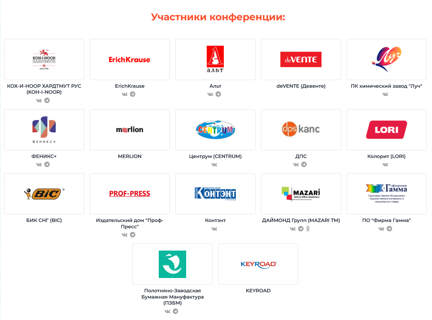 Кто есть кто? Интерактивный состав участников. Логотип каждой компании-участника — это живая гиперссылка, которая ведет на её карточку на Портале «КанцОбоз». Узнать партнера подробнее можно в один клик.