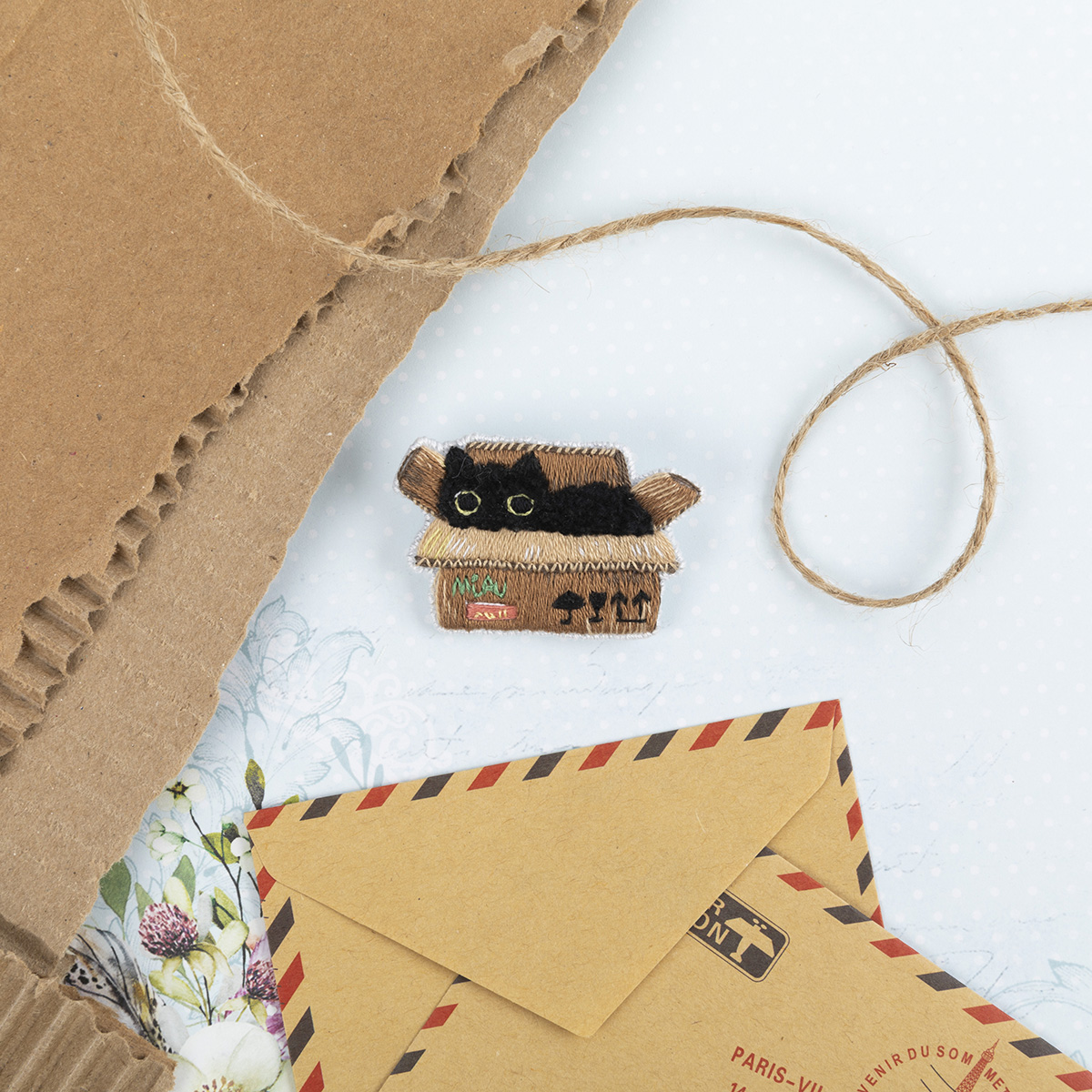 Брошь «Ценная посылка» (арт. JK-2374) с котиком в коробке — сюжет для любителей животных и забавных миниатюр.