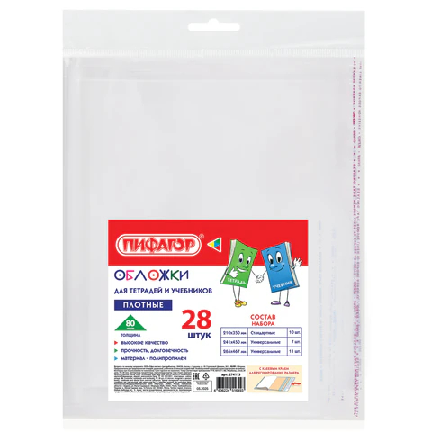Прозрачные плотные обложки ПИФАГОР для тетрадей и учебников изготовлены из полипропилена (ПП) толщиной 80 мкм. Благодаря КЛЕЙКОМУ КРАЮ обложка легко регулируется по ширине.