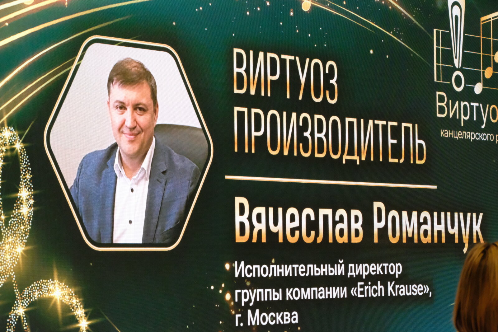 «Виртуоз ПРОИЗВОДИТЕЛЬ» — Вячеслав Романчук, исполнительный директор группы компаний «Erich Krause» (г. Москва). Награда присуждена за вклад в развитие производственных мощностей и укрепление статуса российского производства.