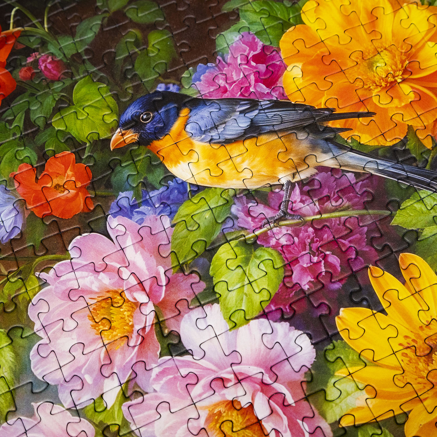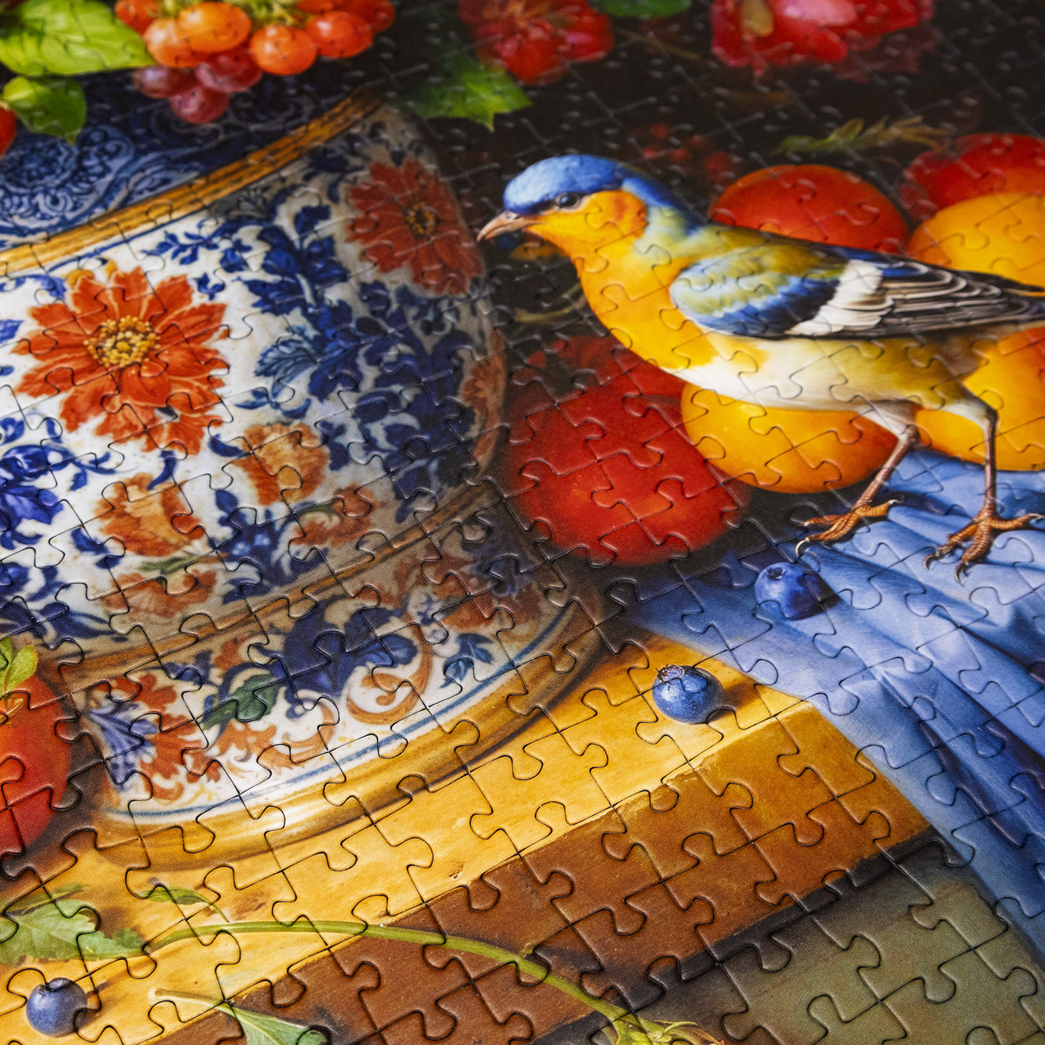 В центре композиции — роскошная ваза с богатым орнаментом, из которой буквально «выстреливает» во все стороны объёмный букет: садовые розы, георгины, пионы и другие цветы переплетаются в плотное цветовое облако. Тёплые жёлтые, оранжевые и малиновые тона встречаются с прохладными синими и лиловыми оттенками, создавая тот самый «фейерверк» цвета. На переднем плане — фрукты и ягоды, которые добавляют сочности и ещё больше усложняют картинку для любителей искать нужный оттенок среди десятков похожих деталей. Птицы, аккуратно расположившиеся на краю стола и среди ветвей, оживляют натюрморт и добавляют ощущение летнего дня.