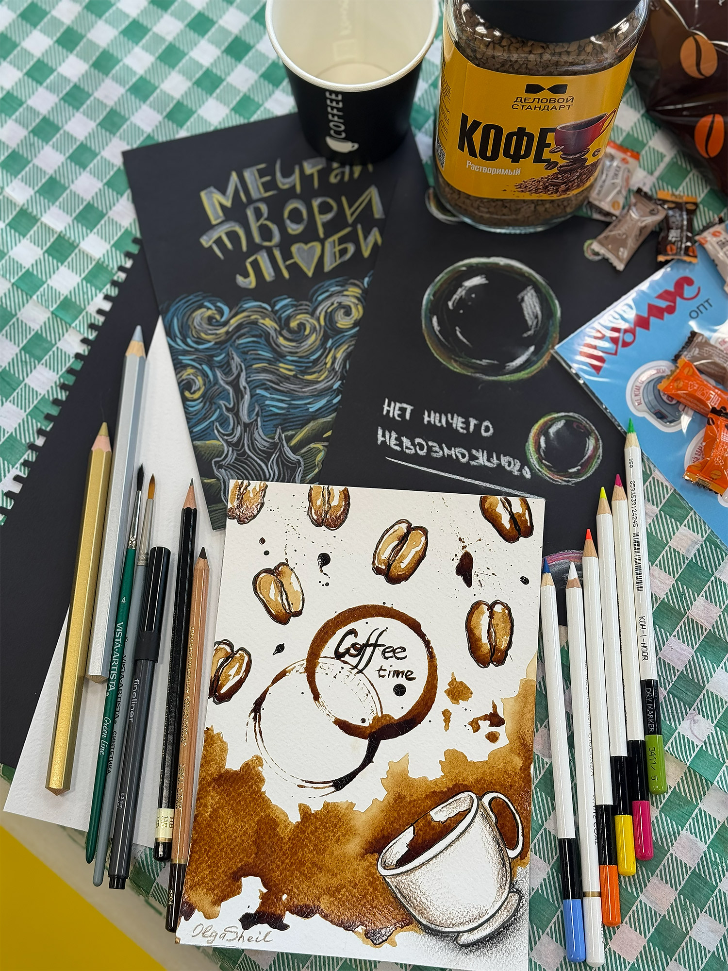 Первым стал «Вкусный кофейный рисунок». Мы рисовали настоящим кофе, создавая атмосферные монохромные работы. Аромат свежесваренного напитка наполнял площадку, создавая уютную и вдохновляющую атмосферу. Это был не просто урок рисования, а настоящий сеанс ароматерапии.