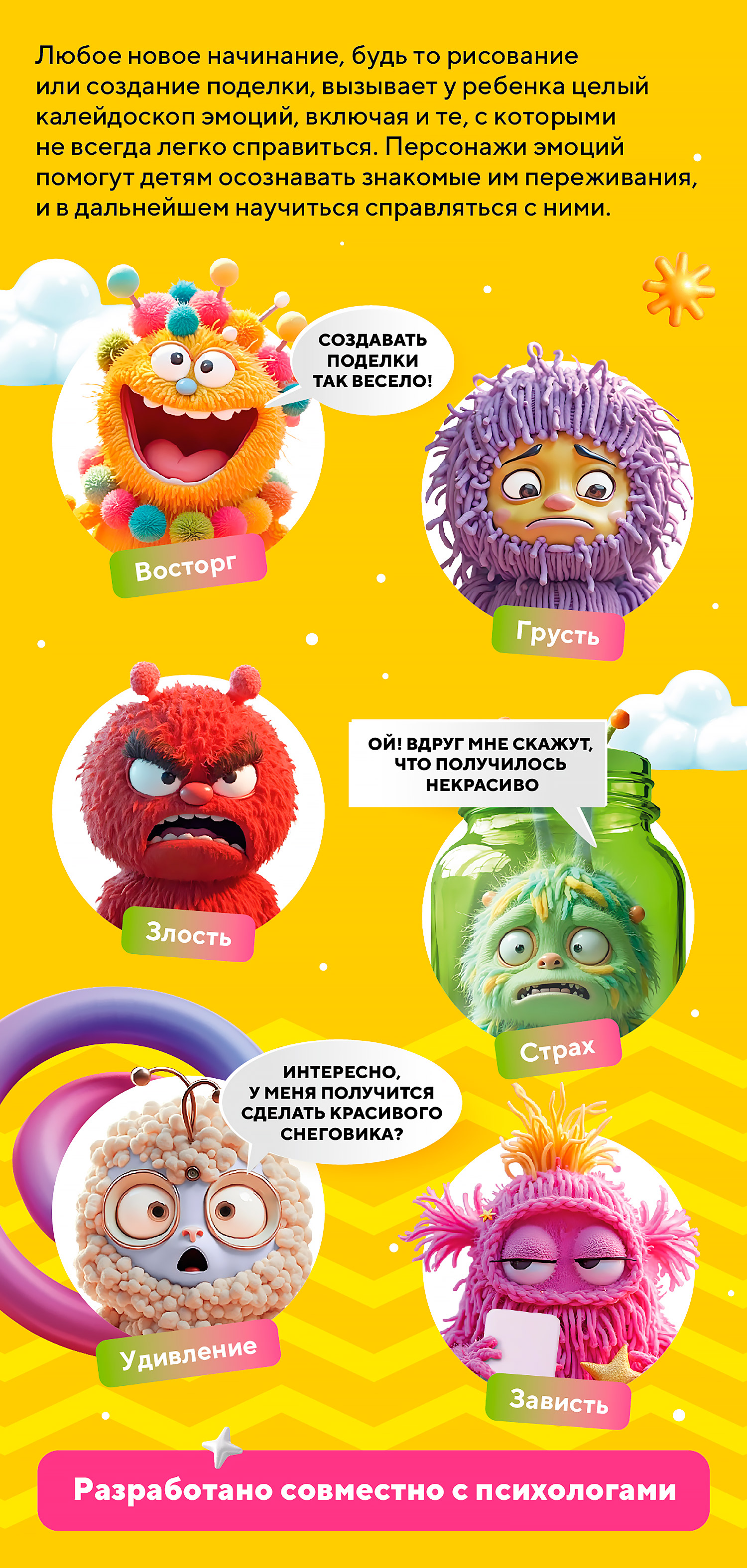 Наша цель — научить детей сначала просто познакомиться с разнообразием эмоций через персонажей на упаковках, затем понимать и называть свои чувства, и в конечном итоге — осознавать причины и научиться управлять своим состоянием.