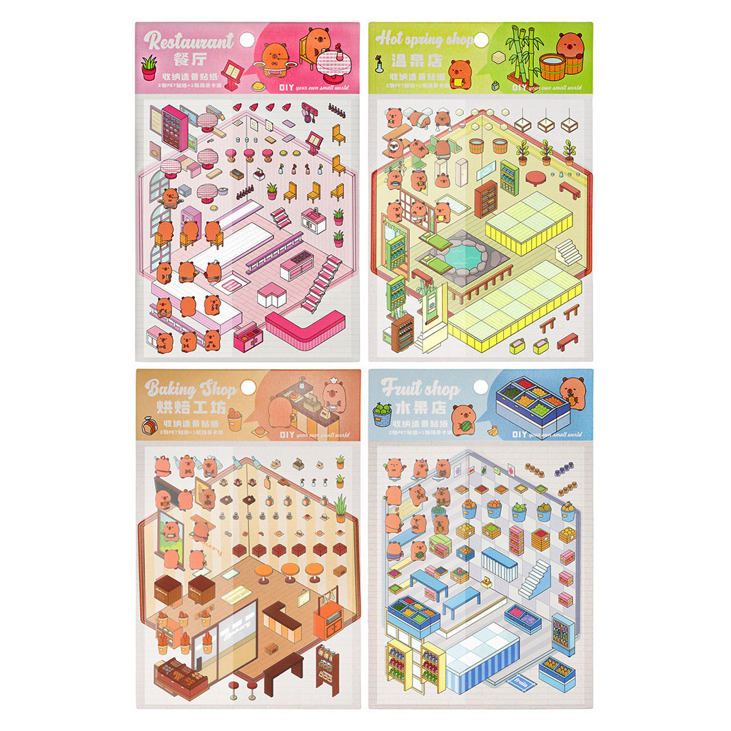 Прозрачные наклейки легко отделяются от основы, подходят для многоразового использования, не оставляя следов при переклеивании в случае ошибки. В ассортименте увлекательные миниатюры: Капибары, кафе и ресторан, сладости, фэнтези и отель. | |