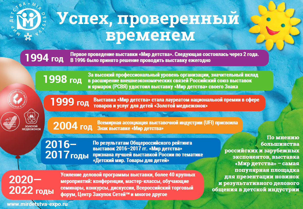 Выставка проводится с 1994 года и, по мнению подавляющего большинства российских и зарубежных экспонентов, является самой популярной площадкой для презентации новинок и результативного делового общения на рынке продукции для детей.